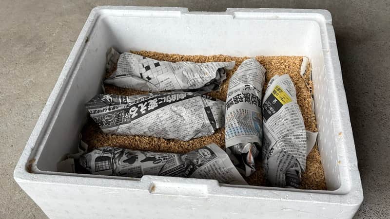 冬の冷え込みが厳しいため、発泡スチロール箱ともみ殻、そして新聞紙を組み合わせて保温性を高めています。