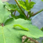 幼虫の発見 | オクラの葉裏に2〜3cmの黄緑色の幼虫 |